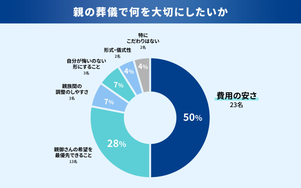 親の葬儀で「費用の安さ」を最も重視する人が50%と最多。「親御さんの希望を最優先できること」は28%、「自分が悔いのない形にすること」は7%にとどまるなど、“お金優先”の意識が浮き彫りに。